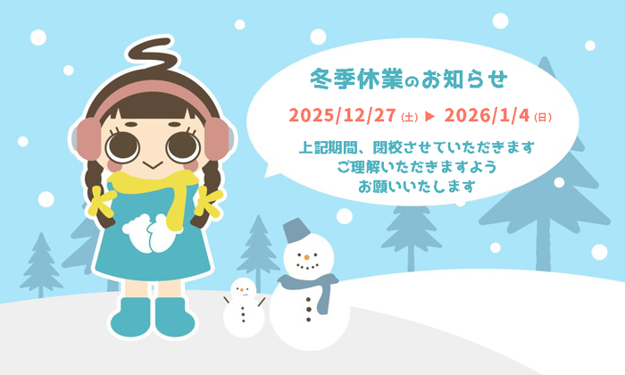 2025年12月27日(土) ~ 2026年1月4日(日)まで閉校とさせていただきますので、お電話・来校でのお問い合わせはお休みとなります。